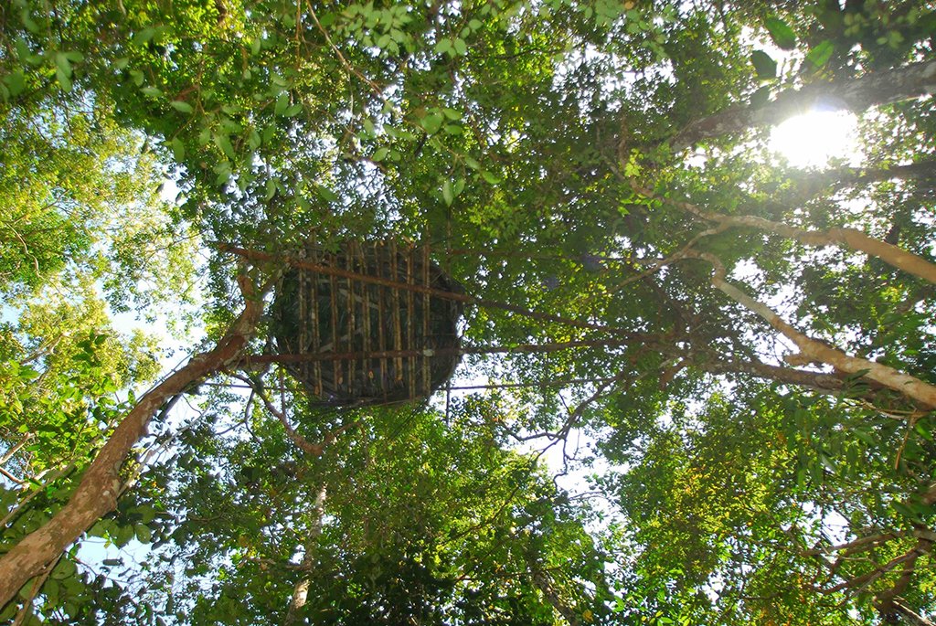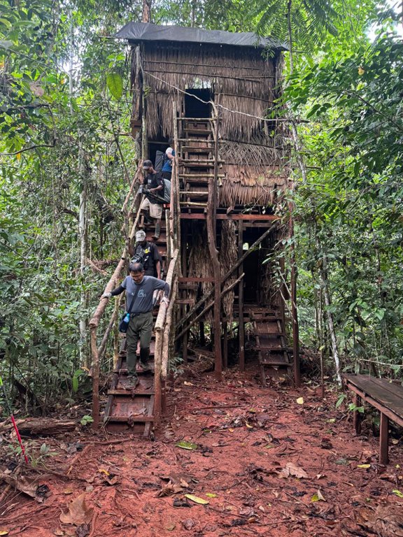 Angående skjulet for slørhaleparadisfuglen, så ligger det 20-25 meyter5 over bakken. Et enkelt skjul, men veldig trygt. Dusinvis av gjester i alle aldre, kvinner, menn, har blitt trukket opp i trekronene for å observere fuglene, til og med folk som er redde for høyder. De bruker et system med tau/trinser og sele. I utgangspunktet «sitter» gjestene i en sele med et tau foran seg for å trekke dem opp, og et sikkerhetstau på ryggen. Begge tauene er festet til stammen eller store grener, 2 festepunkter hver. Supersupertrygt, så lenge gjestene gjør det de blir bedt om å gjøre, som er: ingenting, sitte og kose seg, ikke ta i tauene eller grenene, slipp det løs.